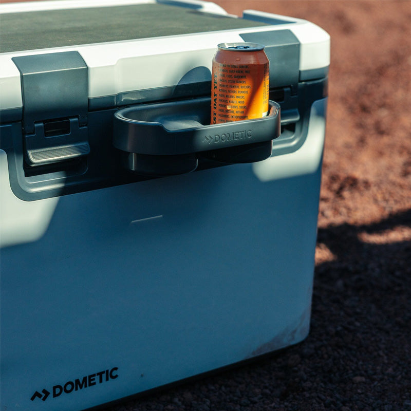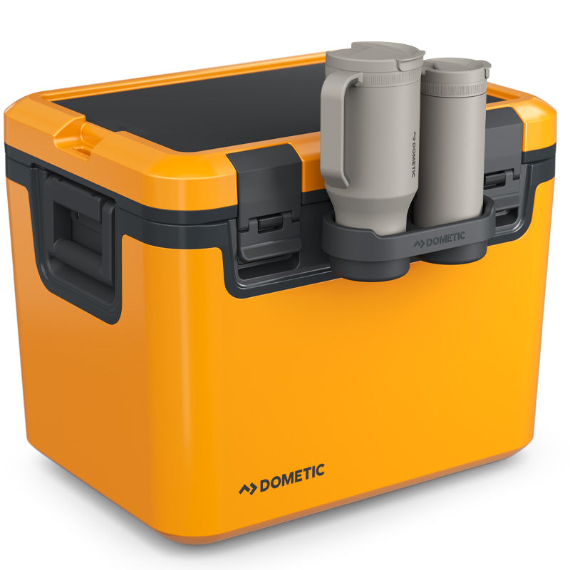 Stop the spills. Pop this dual cup holder onto your Recon Cooler and keep beverages right at hand – one for you, one for a friend . The standard-sized base holds a wide range of cups, bottles, and travel mugs. It’s durably built, lets you access the cooler while the holder’s in use, and has rubber-based compartments to keep cups in place.