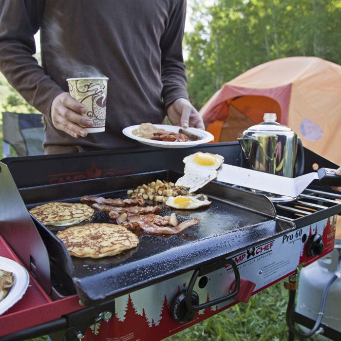 Breakfast at the campsite just got easier. The Camp Chef SG30 Griddle is a single-burner cast iron griddle designed to drop right onto one burner of your Camp Chef Pro 60X stove—turning it into a compact flat-top station perfect for bacon, eggs, pancakes, stir fry, smash burgers, and more.