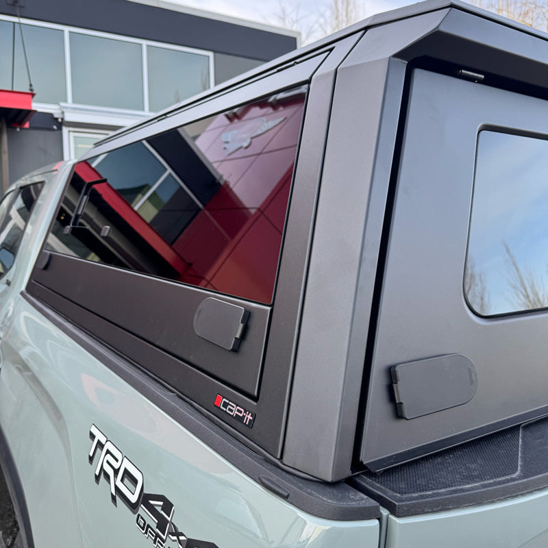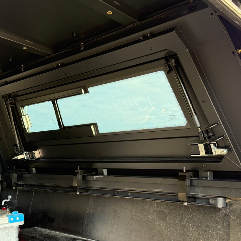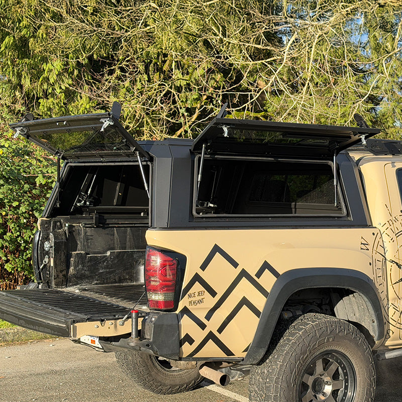 Built from aluminum alloy panels and structure, the CMX delivers corrosion resistance, strong roof capacity, and a refined, modern look that suits daily driving, recreation, and family use. This Side Windows canopy features gullwing-style lift-up side doors with integrated sliding glass windows, allowing light and airflow into the truck bed while maintaining secure, lockable access.