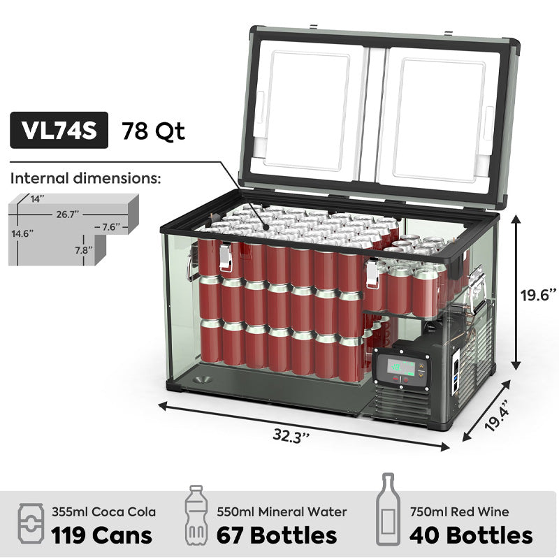 Outdoor Cooling. 0℉~50℉ Cooling Range, VL74 can be used as a fridge or a freezer. VL74 Single Zone. Suitable For Your Vehicle.